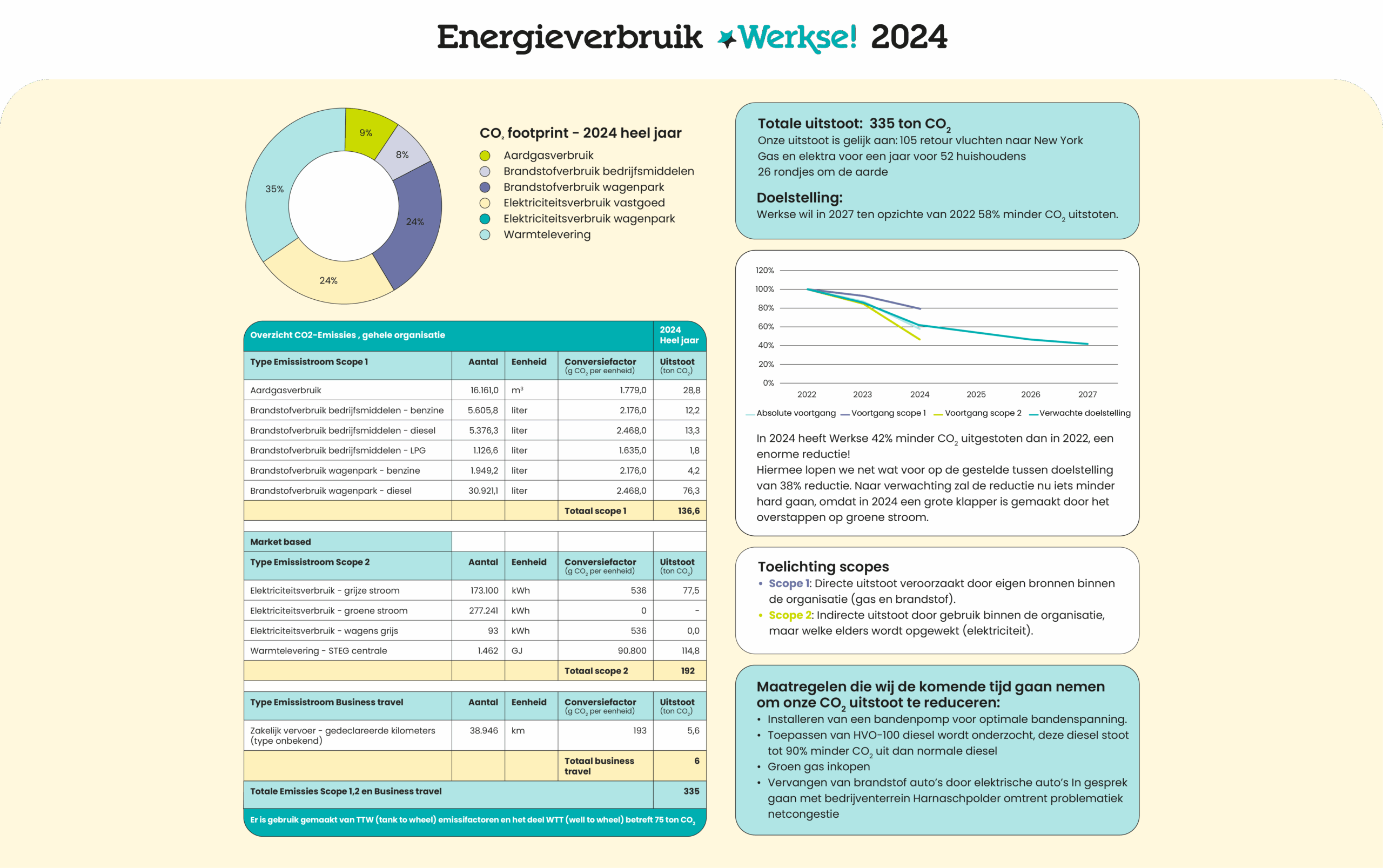 Om onze CO2-uitstoot te begrijpen, stellen we twee keer per jaar onze emissies vast. Dit geeft overzicht en zorgt ervoor dat we de juiste doelen kunnen opstellen om onze uitstoot te verminderen.  Werkse! wil in 2027 58% minder CO2 uitstoten, vergeleken met 2022. Vanaf 2024 hebben wij als doel om onderzoek uit te voeren of te investeren in een aantal maatregelen. Zo gaan we het verbruik van gas, brandstof en elektriciteit drastisch verminderen. De doelstelling per categorie én de maatregelen, zijn in het beleidsdocument te lezen. Lees hier het beleidsdocument.