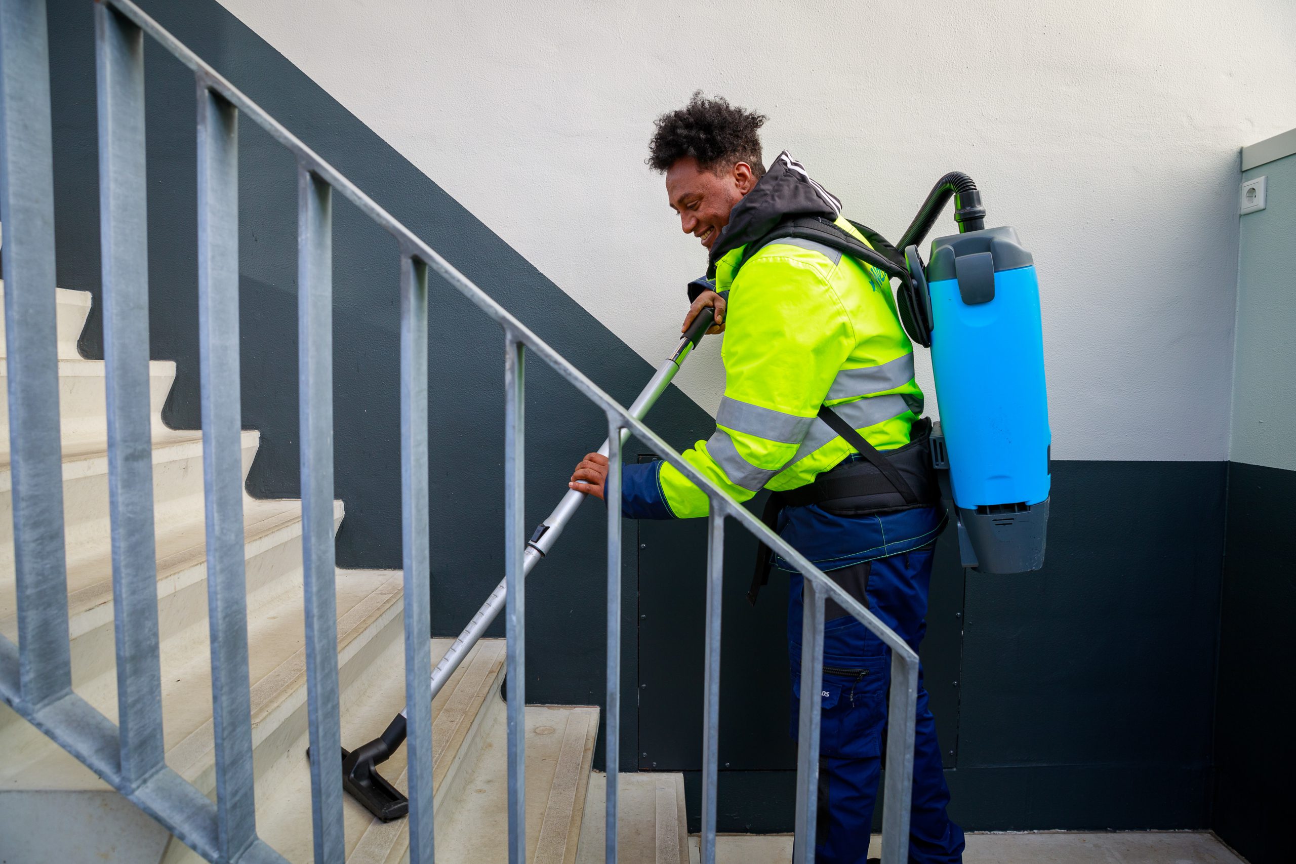 Wie denkt dat het bij garages schoonmaken alleen om vloeren gaat heeft het mis. Robel Mulugeta: ‘We zorgen ook voor schone toiletten, trappenhuizen, hellingbanen, corridors, kantoren en liften. En ook de brandkasten en parkeerautomaten houden we netjes.’ Werk genoeg dus. Als een volleerd vakman somt hij achtereenvolgens de extra taken op: ‘Kauwgom steken, olie lopen, spinrag weghalen, prullenbakken legen. We hebben een rooster met taken. Die staat allemaal op een lijst. Alle taken voor vanmorgen zijn al afgevinkt. We doen iedere dag een andere etage. Alle werk is goed. En werk is belangrijk.’